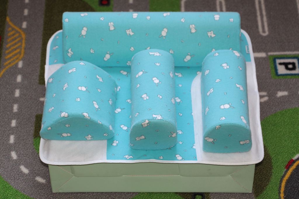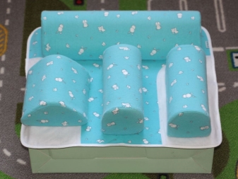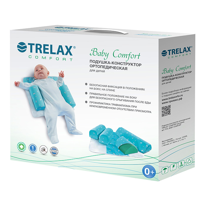 - "Babykomfort" (von 0 bis 3 Monate). Orthopädisches Kissen Design. Trägt zur Normalisierung des Muskeltonus von der einen oder anderen Seite bei. Es ist sehr wichtig für Babys in den ersten Lebensmonaten eine physiologisch korrekte Position des Körpers und der Wirbelsäule zu haben. Dies kann eine Position entweder "auf der Rückseite" oder "auf der Seite" sein. In den ersten drei Monaten empfehlen Kinderärzte eine "auf der Seite liegend" Position, besonders für Babys, die anfällig für häufiges Aufstoßen sind. Für die Abgabe des Kissens solcher Lage im Set gibt es zwei Rollen der dreieckigen Form.Zur Befestigung des Rückens wird ein großer, und unter dem Bauch kleiner Aufsatz verwendet. Bei Torticollis mit einer kleinen Rolle können Sie den Nacken auch nach den Empfehlungen des Orthopäden fixieren. Hinweise für die Verwendung des Konstruktorkissens sind Fixierung der Wirbelsäule entsprechend der physiologischen Position, Verhinderung der Asymmetrie der Wirbelsäule und des Schädels, muskuläre Dystonie. Das Set enthält eine Haltefolie, zwei ovale Rollen gleicher Größe, eine kleine Rolle und eine große. Jeder von ihnen hat eine individuelle Abdeckung aus 100% Baumwolle.