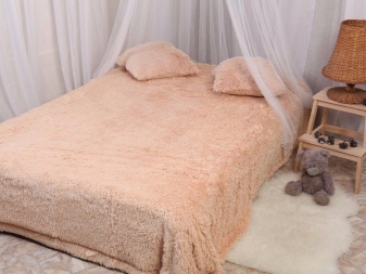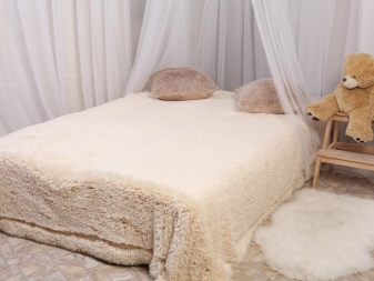 Sie können beide Optionen mit langen und kurzen Haaren finden. Es ist erwähnenswert, dass ein kurzes Nickerchen viel einfacher zu pflegen ist, Sie können Ihr neu erworbenes Produkt länger in gutem Zustand halten. Eine flauschige Bettdecke mit langen Haaren muss nach jeder Wäsche lange Zeit in Ordnung gebracht werden. Solche Produkte haben jedoch ihre Fans. In der Tat, abgesehen von der Tatsache, dass sie schön aussehen, sind sie auch sehr weich im Griff.