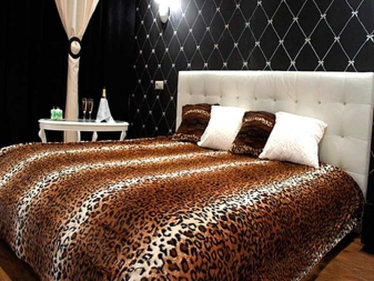 - Tierdrucke. Unter den Mustern, stilisierte Tierhäute, besonders geliebt Pelzdecken mit Leoparden- oder Tigerfarben.In der Praxis gibt es aber auch oft andere Farben, die an exotische Tiere erinnern, und sogar die Haut von "Bären", die im Inneren eines Landhauses besonders stilvoll wirken.