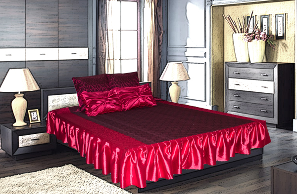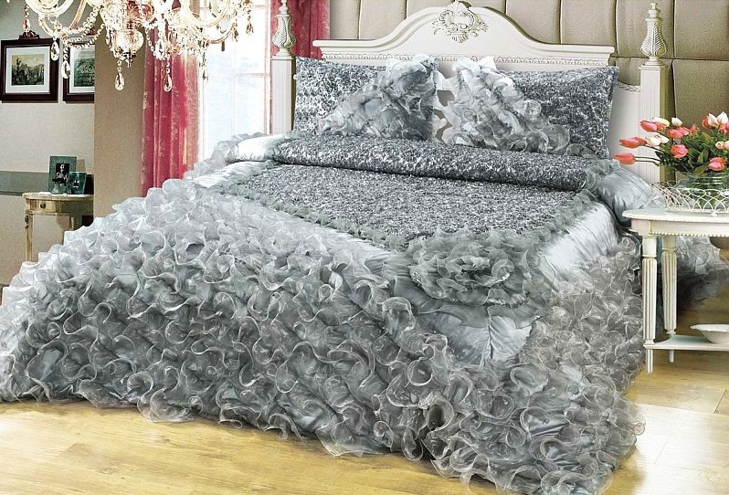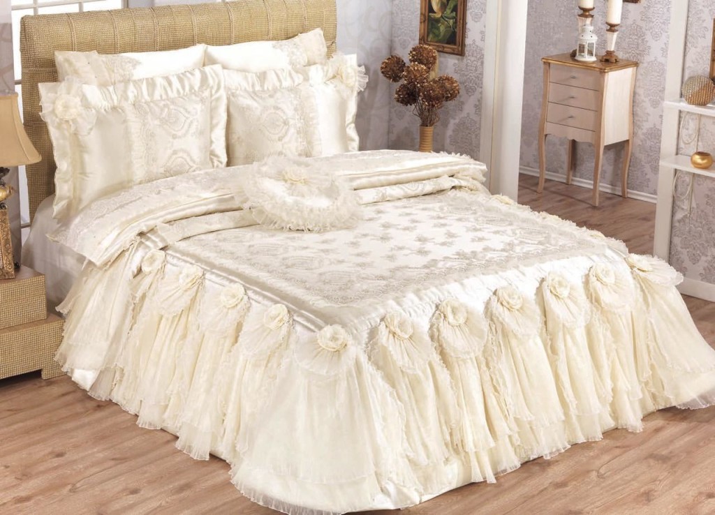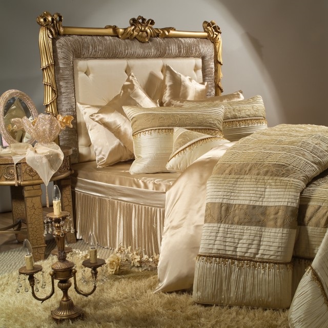 Innenausstattungen aus Satin und Taft wirken luxuriös und geheimnisvoll. Sie werden für dekorative Tagesdecken verwendet und werden oft mit Organza, Tüll, reichen Ornamenten und Stickereien kombiniert.