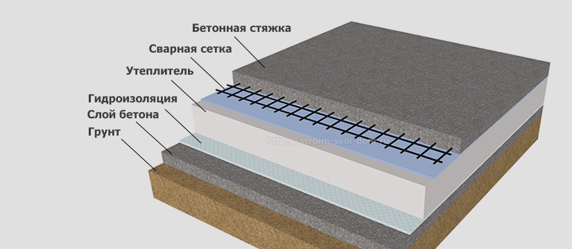 Als nächstes wird die Dicke jeder Schicht des Kuchens berechnet. Die Sandschicht sollte 10-15 cm betragen.In privaten Haushalten kann eine zusätzliche Kiesschicht nicht verwendet werden, da die Betonoberfläche nur wenig belastet wird. Die nächste Schicht ist grob, etwa 10 cm dick, Sie können ein verstärktes Netz verwenden. Die Dicke der Isolierung sollte 10 cm betragen und die letzte Schicht ist ein Betonestrich. Schichtdicke - nicht weniger als 7 cm für Wohnräume. Alle oben genannten Schichten werden zusammengefasst und wir erhalten einen Wert, der der Dicke des "Kuchens" vom Boden bis zum Nullniveau des Bodens entspricht.