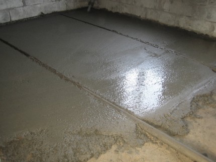 Bei der Schaffung eines Betonpflasters ist abgeschlossen. Nach dem vollständigen Trocknen können Sie mit der Hauptbeschichtung fortfahren. Sie können alle Materialien verwenden - Holz, Laminat, Linoleum, Keramikfliesen.