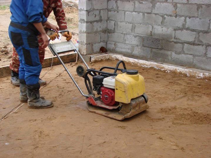 - Stampfer - Bodenverdichter, um ein festes Kissen für Beton zu schaffen. Gut gerammte Schichten aus Erde, Sand, Schotter, Blähton dienen als Qualitätsunterlage für den Betonboden.