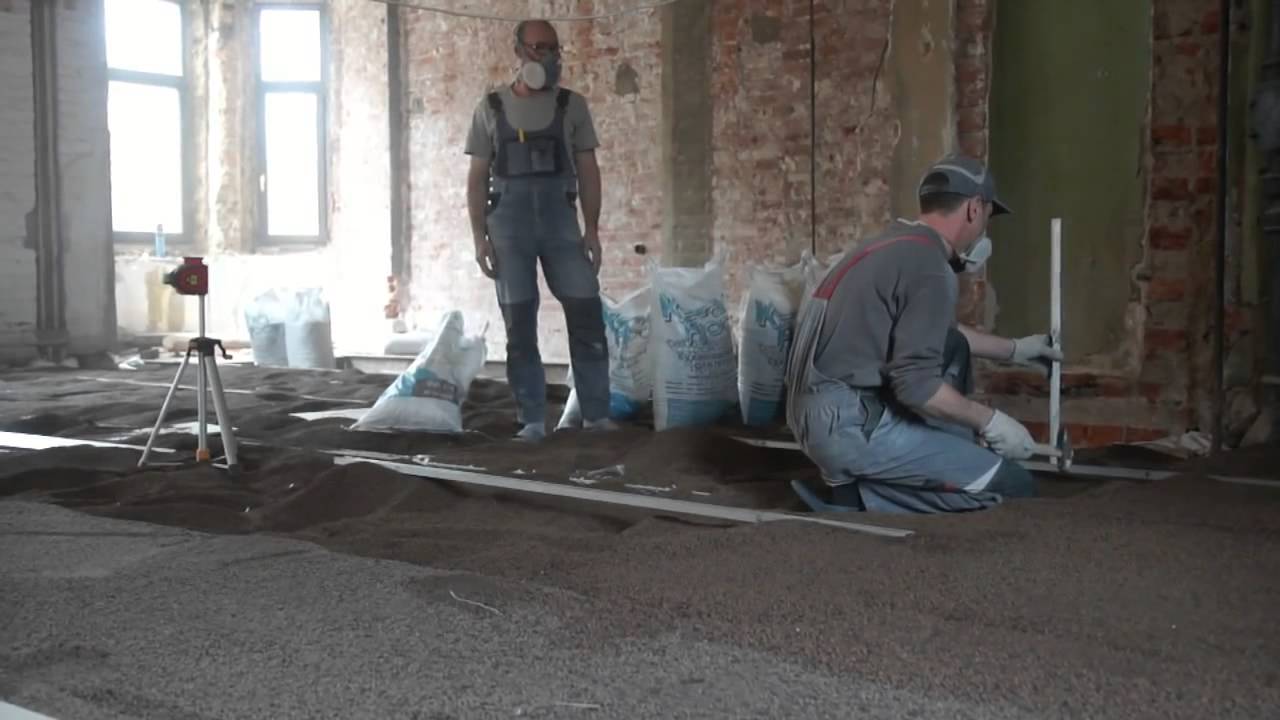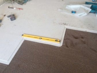 - Als nächstes müssen Sie die oberste Ebene der Verfüllung markieren. Verwenden Sie dazu eine Laser- oder Wasserwaage. Die Höhe der Markierungen kann zwischen 2 und 6 cm variieren.Dieser Indikator hängt direkt von der Unebenheit des Bodens ab.