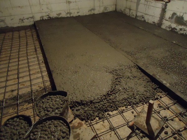 Installieren Sie ein Bewehrungsnetz mit einer Höhe von 3 cm Racks Vorbereitung der Mischung für Estrich. Das Betonieren des Bodens erfolgt in Teilen, das Glätten der Fächer mit einer Kelle und das Überprüfen des Füllstands, wir erwarten das Trocknen (dieser Prozess dauert normalerweise einen ganzen Monat). Wir führen die Endbearbeitung durch.