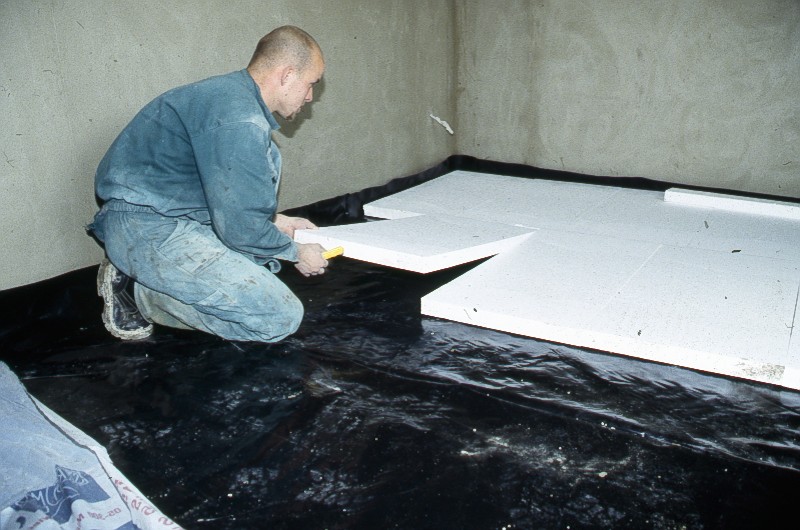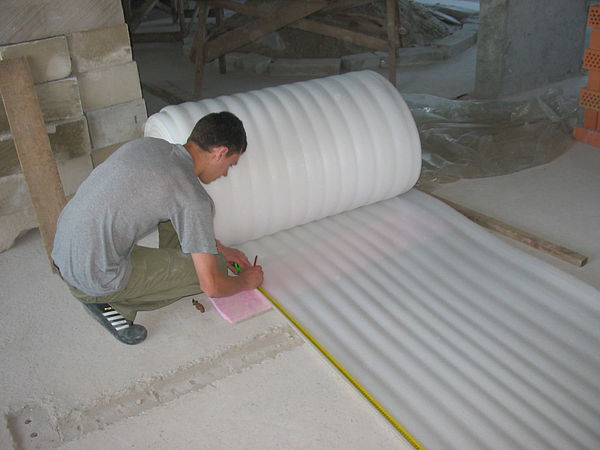 - Vorbereitung der Isolationsschicht. Häufig verwendeter Schaum mit hoher Dichte. Die Schicht sollte mindestens 5 cm dick sein.