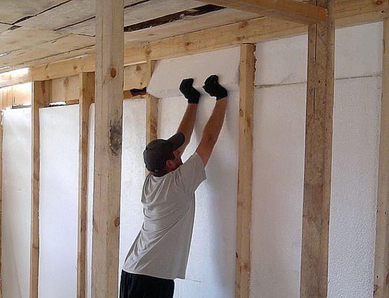Wir schneiden expandiertes Polystyrol aus, wir stapeln dichtes Polyethylen. Wir verbinden die Ränder der Leinwand mit Klebeband, wir pflanzen an die Wände und befestigen.