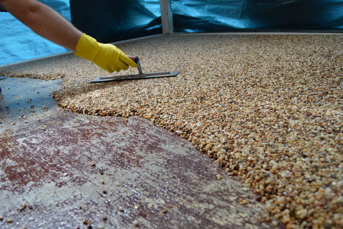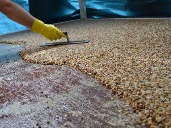 Ein separater Moment ist die Aufnahme von zusätzlichen Materialien ausschließlich zu ästhetischen Zwecken in die Masse - zum Beispiel kleiner Naturstein. Oft mit dem gleichen Zweck verwendet werden kann und abriebfeste Farbe, zu kleinen Stücken zerkleinert oder zu Krümel.
