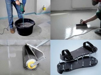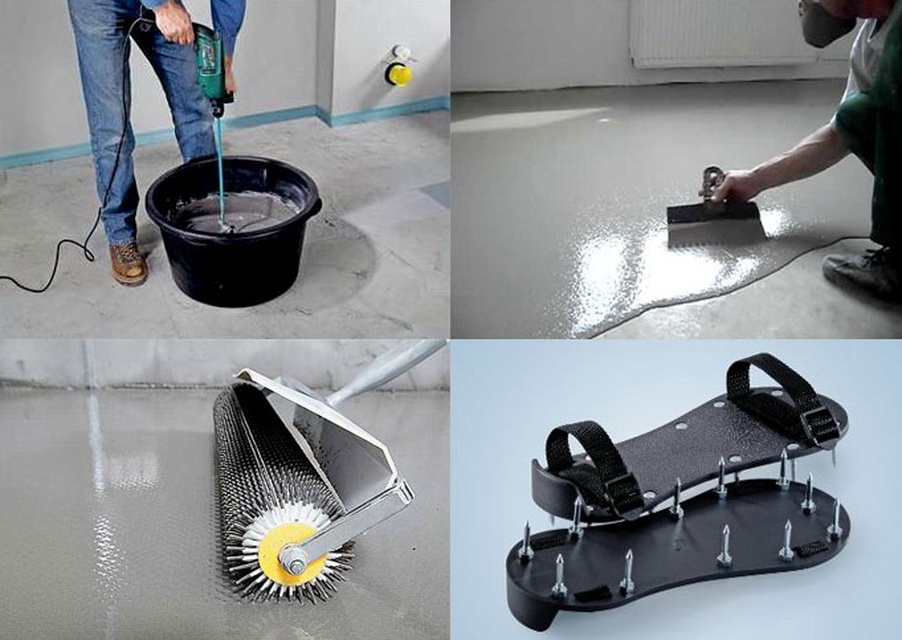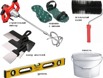 In den häuslichen Verhältnissen ziehen es viele Männer heute vor, zu versuchen, ihre eigenen zu füllen, und in diesem Fall sind die Werkzeuge natürlich etwas bescheidener. Um solche Aufgaben zu erfüllen, sind ein Bohrer mit einer speziellen Düse zum Rühren von flüssigen Baumaterialien, eine große Kapazität (zumindest in zwei Eimern des Volumens), Spachteln verschiedener Formen, eine Belüftungswalze mit Stacheln und die gleichen mit Stacheln versehenen Farbrinnen erforderlich.