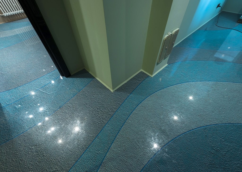 Die Zusammensetzung, die zum Füllen eines selbstnivellierenden Bodens verwendet wird, ist in der Regel monophon oder einfach transparent. Für ein einzigartiges Design benötigen Sie daher ein besonderes Dekor. Die besten Designer der Neuzeit kommen meist aus der Situationbietet den sogenannten 3D-Boden, in dem einige fremde Objekte eingebaut sind, um das Interieur zu dekorieren.