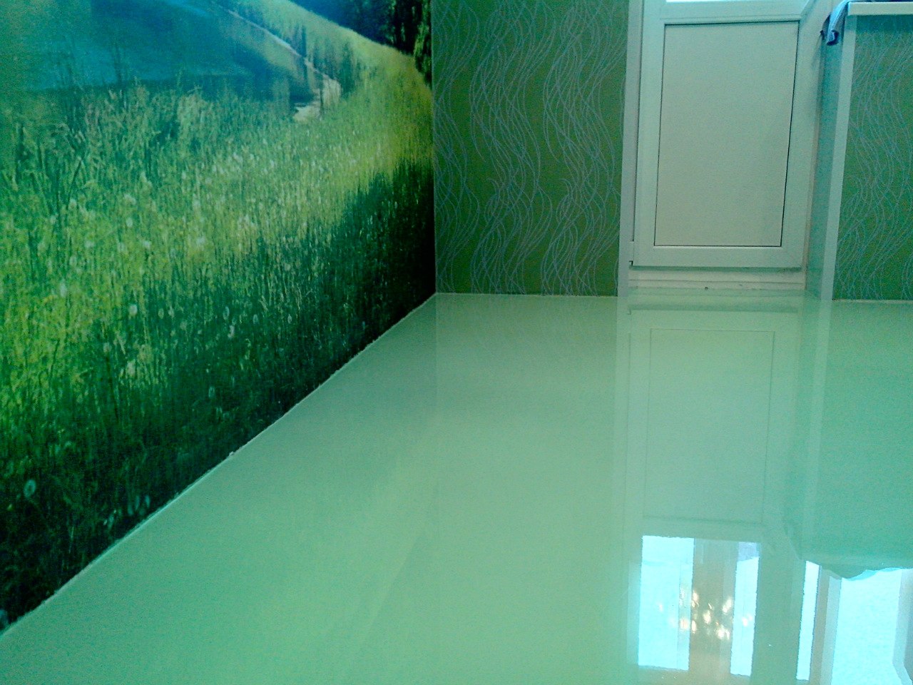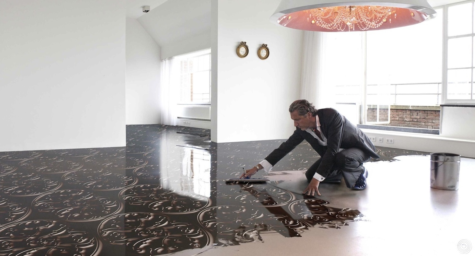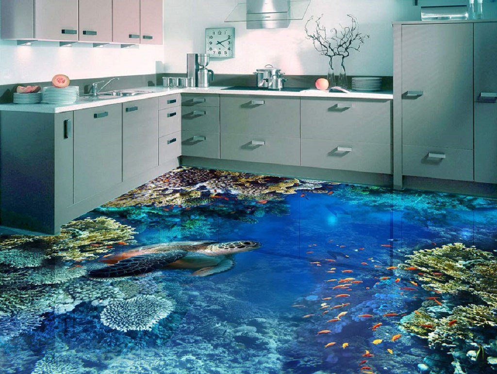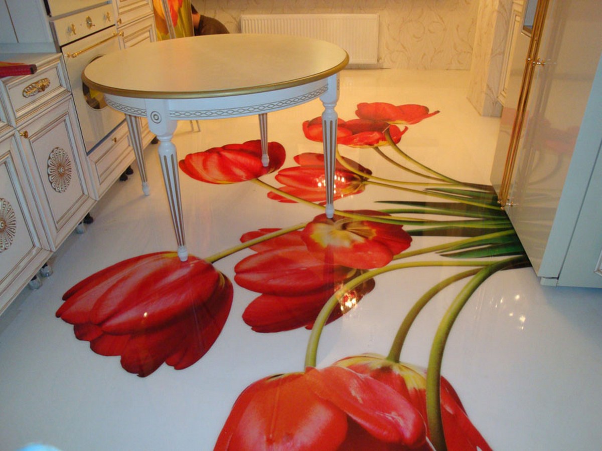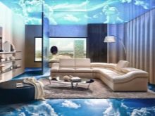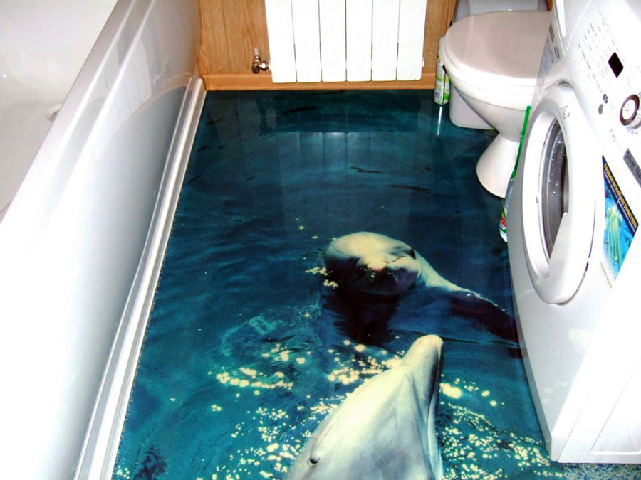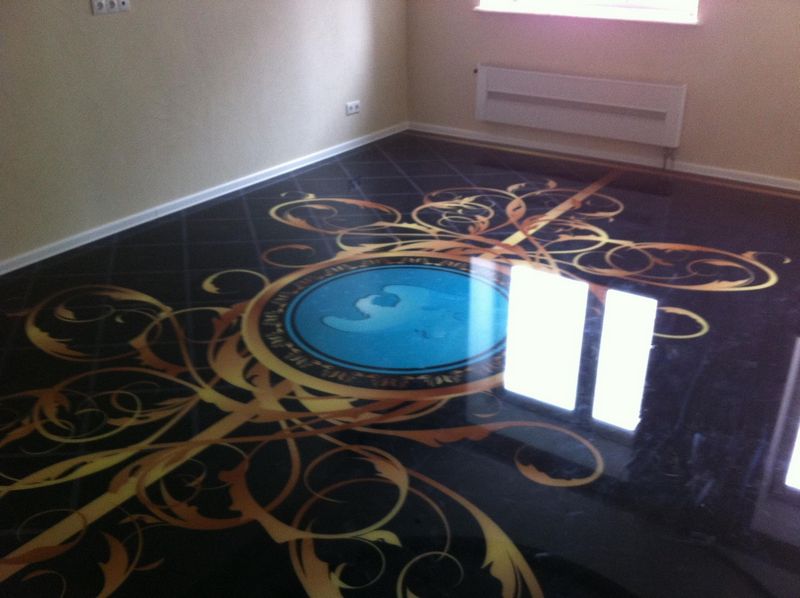 Wenn Sie interessante 3D-Bilder auf dem Boden bilden möchten, dann können diese separat gekauft, auf eine perfekt glatte Oberfläche des selbstnivellierenden Bodens geklebt und mit Epoxidharz sowie Lack beschichtet werden. Diese Etage kann frühestens eine Woche nach der ganzen Arbeit genutzt werden. Wenn es noch einige Mängel im Raum gibt, sind sie in 24 Stunden erreichbar.