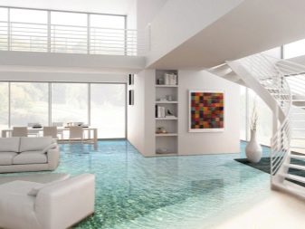 - Selbstnivellierende Böden sehen sehr schön und vorzeigbar aus. Darüber hinaus sind sie eine ausgezeichnete Wahl für Menschen, die sich von alten Traditionen abwenden und frische und originelle Noten in ihre Häuser bringen möchten.Ein ungewöhnlicher transparenter Boden ist also eine mutige und mutige Entscheidung. Es sollte in einem hellen Raum mit viel natürlichem und künstlichem Licht installiert werden. Solch ein Ensemble wird geräumiger und moderner aussehen.