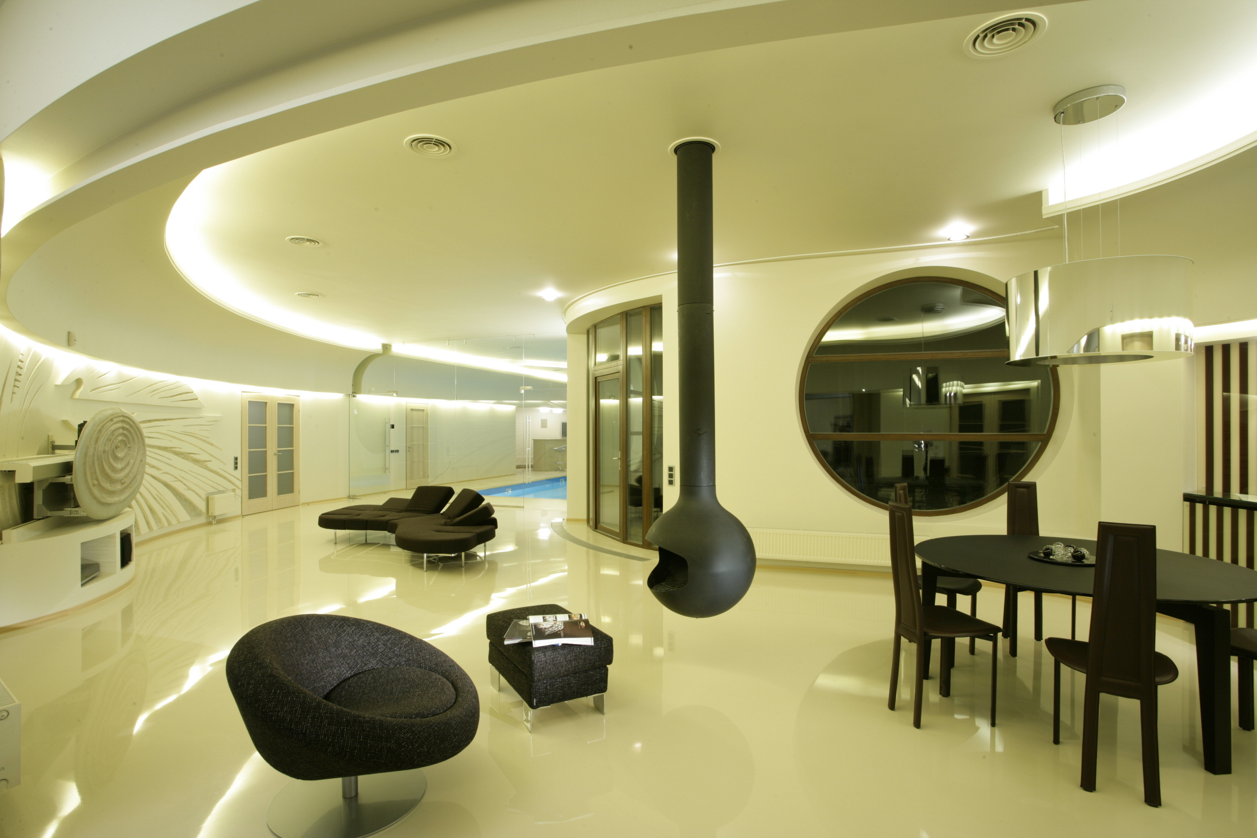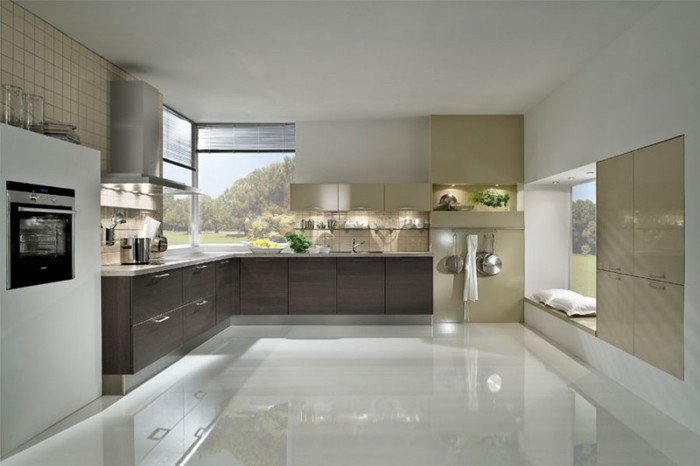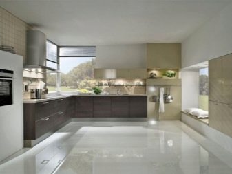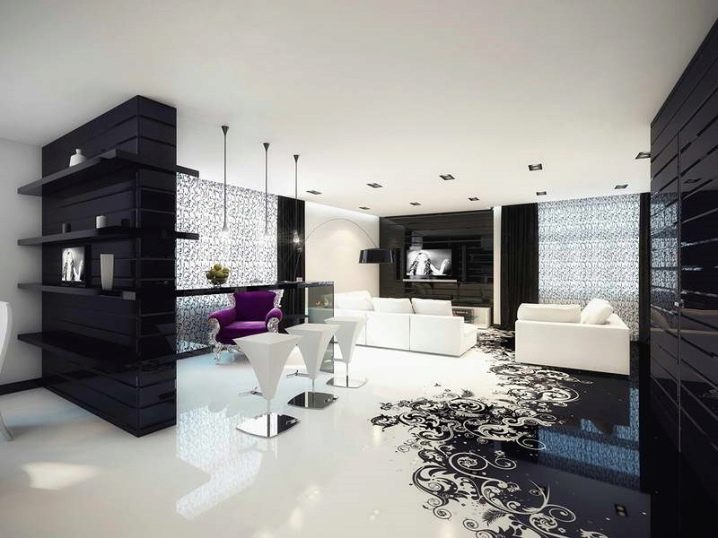 - Universal sind schneeweiße glänzende Böden. Sie werden gleichermaßen stilvoll und modisch aussehen, wie in klassischen oder ausgefallenen Ensembles, in modernen oder futuristischen Umgebungen. Auf einem ähnlichen Hintergrund sehen helle und kontrastierende dunkle Möbel groß aus. Man muss nur bedenken, dass es sich in zu weißen Räumen lohnt, helle Akzente verschiedener Farben zu verwenden, die die übermäßige Weiße verwässern.