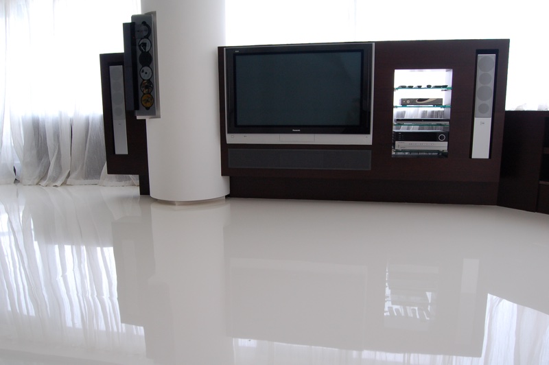 Experten empfehlen, die Bodenabschnitte für einzelne Teile der Basis zu füllen. Versuchen Sie, keinen Zentimeter verfügbaren Platz zu verpassen. Nach Ablauf der auf der Verpackung angegebenen "Reifezeit" kann die Oberfläche poliert und mit einem speziellen Polymerlack behandelt werden