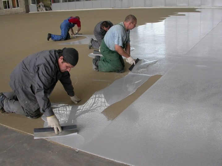 Wenn Sie alle Arbeiten selbst erledigen, sollten Sie wissen, dass Sie den Boden schnell mit Flüssigkeit füllen müssen, ohne eine Minute zu verlieren. Um dies zu tun, ist es besser, einen Assistenten zu nehmen, der die nächste Portion der Mischung knetet, während Sie die bereits vorbereitete Masse auslegen und ebnen.