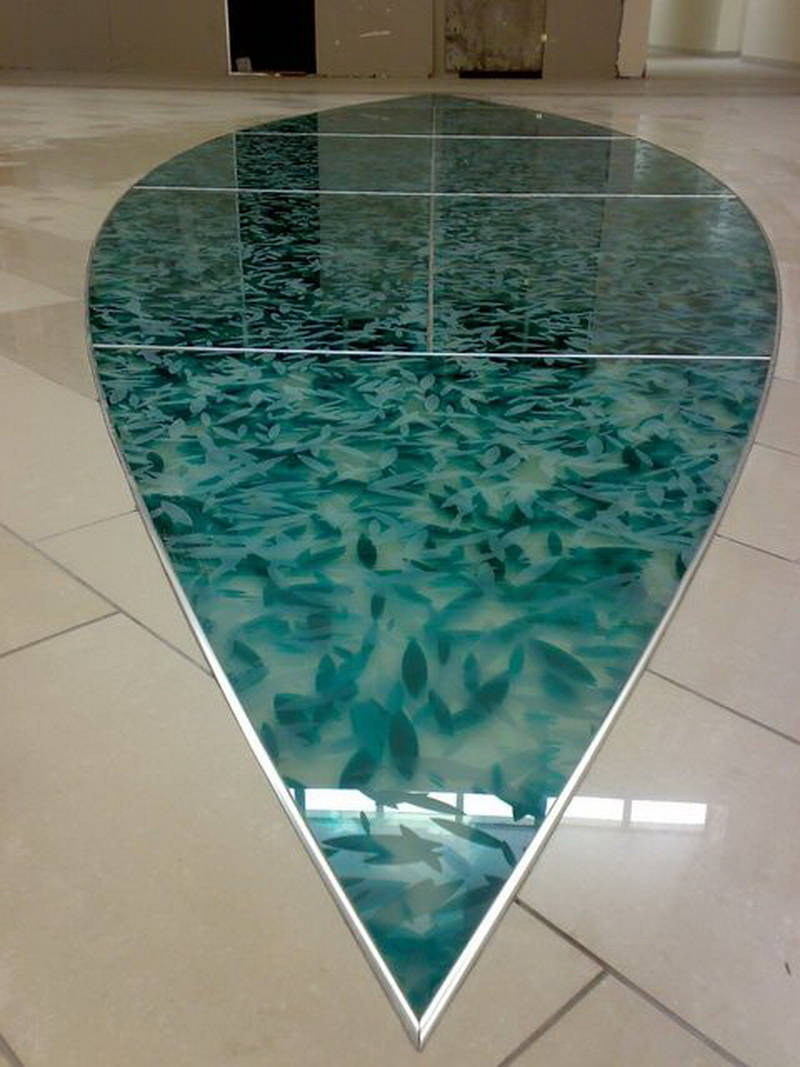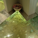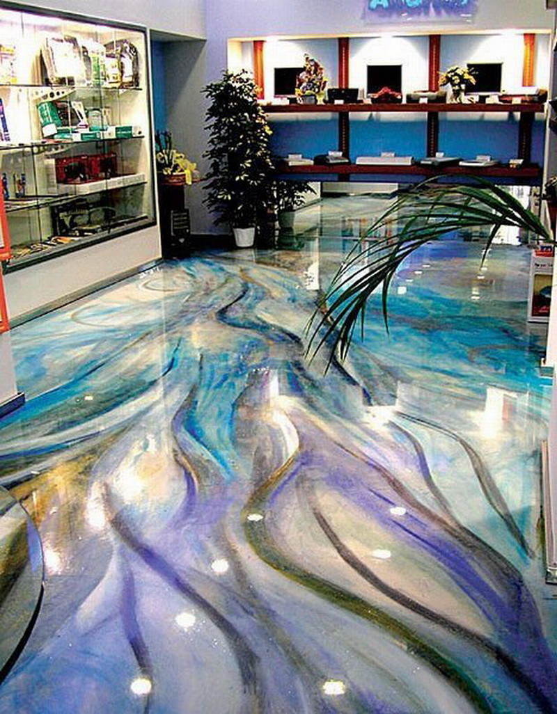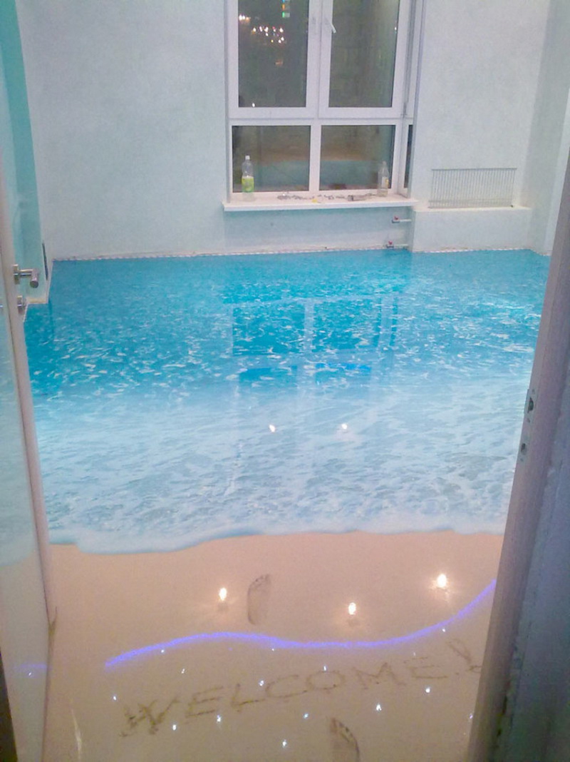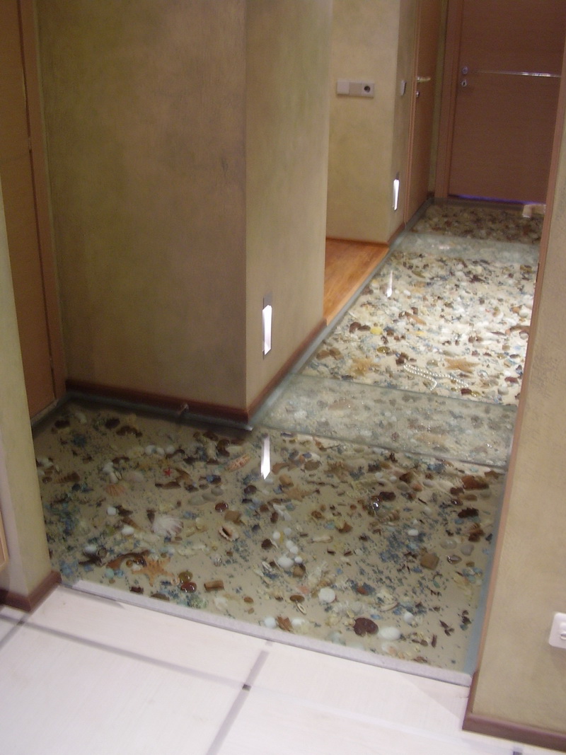 Darüber hinaus oft zum Gießen des Bodens auf flüssiges Glas.Ein solcher selbstnivellierender Boden nach der Installation erzeugt eine glatte und glänzende Oberfläche, die dem echten Glas nur in flüssiger Form sehr ähnlich ist. Es wird oft in Krankenhäusern gefunden, weil es leicht zu reinigen ist und keine Bakterien aufnimmt. In der Tat ist flüssiges Glas immer glänzend und transparent, aber es ist möglich, es zu malen, um einen anderen Farbton zu erreichen. Verwenden Sie in diesen Fällen spezielle Farbstoffe, die zu der Mischung hinzugefügt werden.