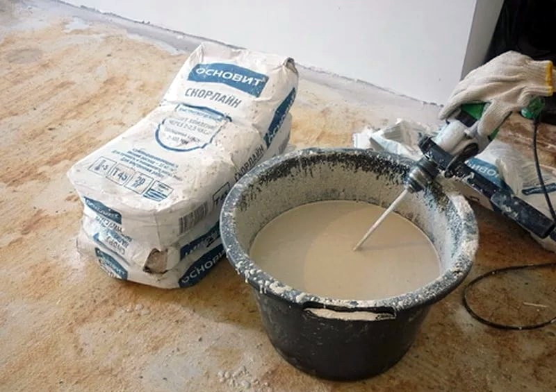 - Mischmischung. Dies sollte unmittelbar vor dem Auftragen auf die Oberfläche erfolgen. In das Gefäß werden alle Komponenten gemischt, und dann kann man füllen. Das Nivellieren ist bequem mit einem Spatel. Dies sollte schnell geschehen, da es einen solchen Boden für 15-20 Minuten trocknet.