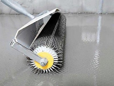 - Rollenverarbeitung. Es ist besser, eine Nadelrolle zu benutzen, da es hilft, Luftblasen in der Mischung loszuwerden. Auf die noch getrocknete Oberfläche Schuhe mit Spikes ziehen.