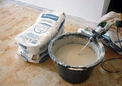 - Vorbereitung des Materials für das weitere Gießen. Es ist besser, die Mischung zu mischen, bevor Sie mit dem zweiten Punkt fortfahren, so dass Sie keine Zeit verlieren. Wie im ersten Schritt erwähnt, ist die gesamte Anleitung, die Technologie der Füllung auf der Verpackung der Zusammensetzung verfügbar. Es ist äußerst wichtig, alle Regeln zu befolgen und vorsichtig zu sein. Gießen Sie die in der Anleitung angegebene Wassermenge in den Lösungsbehälter. Danach gießen Sie das Pulver vorsichtig. Es ist nicht nötig, etwas anderes hinzuzufügen.Es wird empfohlen, die Mischung mit einem Bohrer mit einer geeigneten Düse oder einem Konstruktionsmischer zu mischen, so dass die Lösung qualitativ herauskommt. Sie müssen sich bis zum Zustand einer homogenen Masse einmischen und dann für zehn bis fünfzehn Minuten stehen lassen und dann erneut mischen.