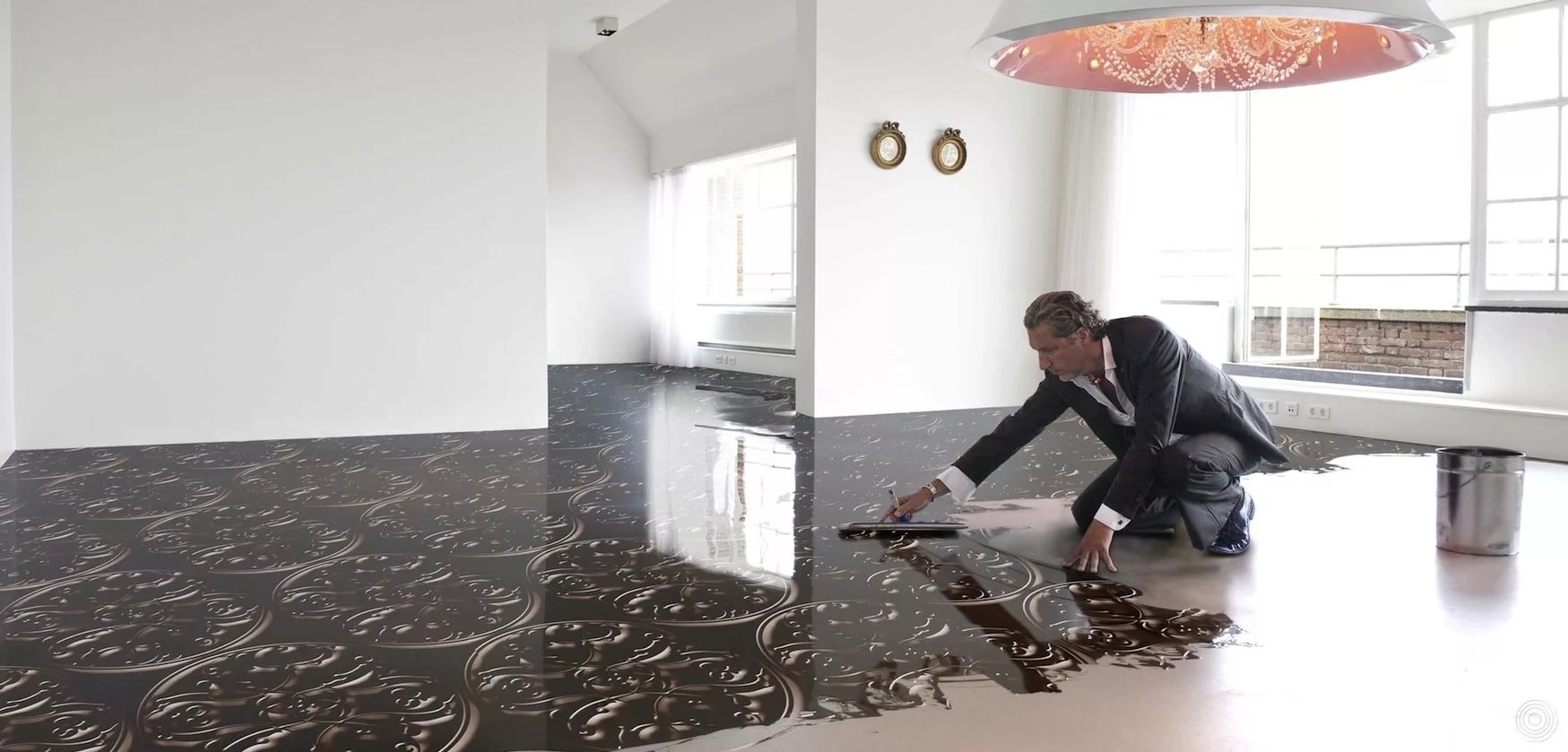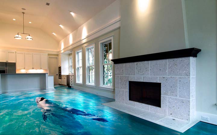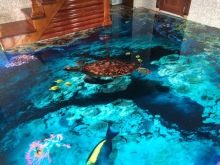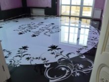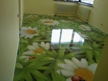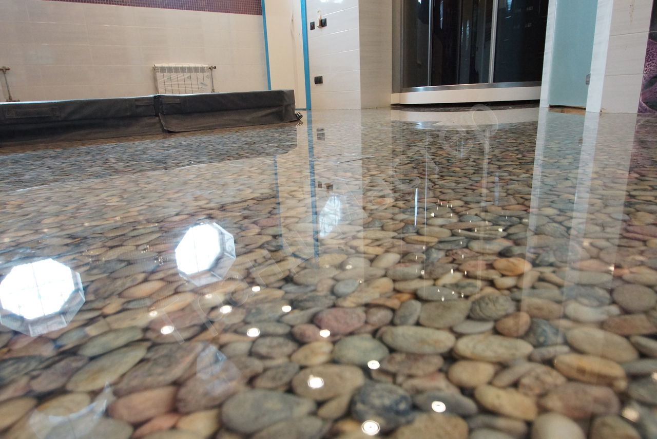 - Volumetrische Zeichnungen und Abstraktionen zwischen Polymerschichten sehen wunderschön aus. Sie können die gesamte Oberfläche des Bodens einnehmen oder eine partielle Verzierung erzeugen.