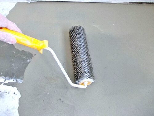 - Bis die Mischung vollständig trocken ist, fügen Sie der Beschichtung zusätzliche Ebenheit hinzu, indem Sie eine mit Nieten versehene Konstruktionswalze verwenden.