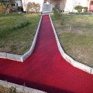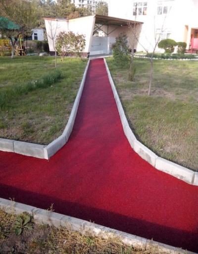 Dank dieser ungewöhnlichen Lösung werden die Wege im Garten immer frisch und sauber aussehen, ihre Farbe wird lange Freude machen. Als Grundlage können Sie in diesem Fall eine kleine Kachel verwenden.
