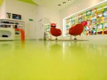 Der Polymerboden unterscheidet sich grundlegend von anderen Arten von Bodenbelägen, weil er nicht passt und gegossen wird. Das Material ist auf der Basis verschiedener Polymere hergestellt und wird als Flüssigkeit verkauft. Um diese Art von Boden zu füllen, muss zuerst eine vollwertige Estrichbohle oder ein anderes dichtes Material hergestellt werden, auf das ein flüssiges Polymer mit einer dünnen Schicht gegossen wird. Das, nach einer bestimmten Zeit einfrierend, ergibt eine vollkommen glatte und vor allem - eine glatte (wegen der flüssigen Eigenschaften, um ein gleichmäßiges Niveau zu bilden) Oberfläche ohne die geringsten Verbindungen.