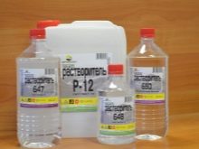 - Chemisches Lösungsmittel, das benötigt wird, um Verunreinigungen zu entfernen, die von der flüssigen Masse übrig geblieben sind, die mit benutzten Werkzeugen verwendet werden soll. Es gibt kein universelles Lösungsmittel, das für alle Arten von selbstnivellierenden Böden geeignet ist, daher muss es auf der Grundlage der Anweisungen ausgewählt werden, die auf dem Glas mit der Mischung des selbstnivellierenden Bodens angegeben sind.