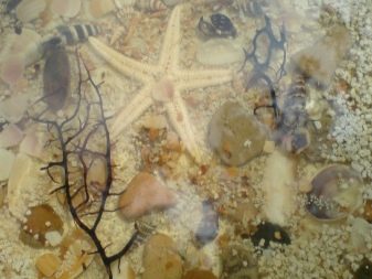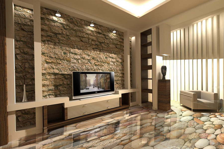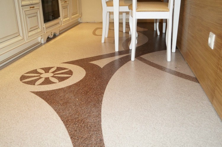 Wenn die Zusammensetzung visuell zu verdicken beginnt, wird ihre Beschleunigung über die Oberfläche und das Rollen mit einer Nadelwalze gestoppt - die Zeit ist reif für eine ästhetische Dekoration der Beschichtung. Im modernen Design wird es aktiv verwendet, um irgendwelche fremden Elemente in den Boden zu montieren, unter denen sich kleine Kieselsteine und Muscheln befinden, sowie Münzen und andere dekorative Elemente, die nach dem Erstarren in das Material "eingeklebt" werden.