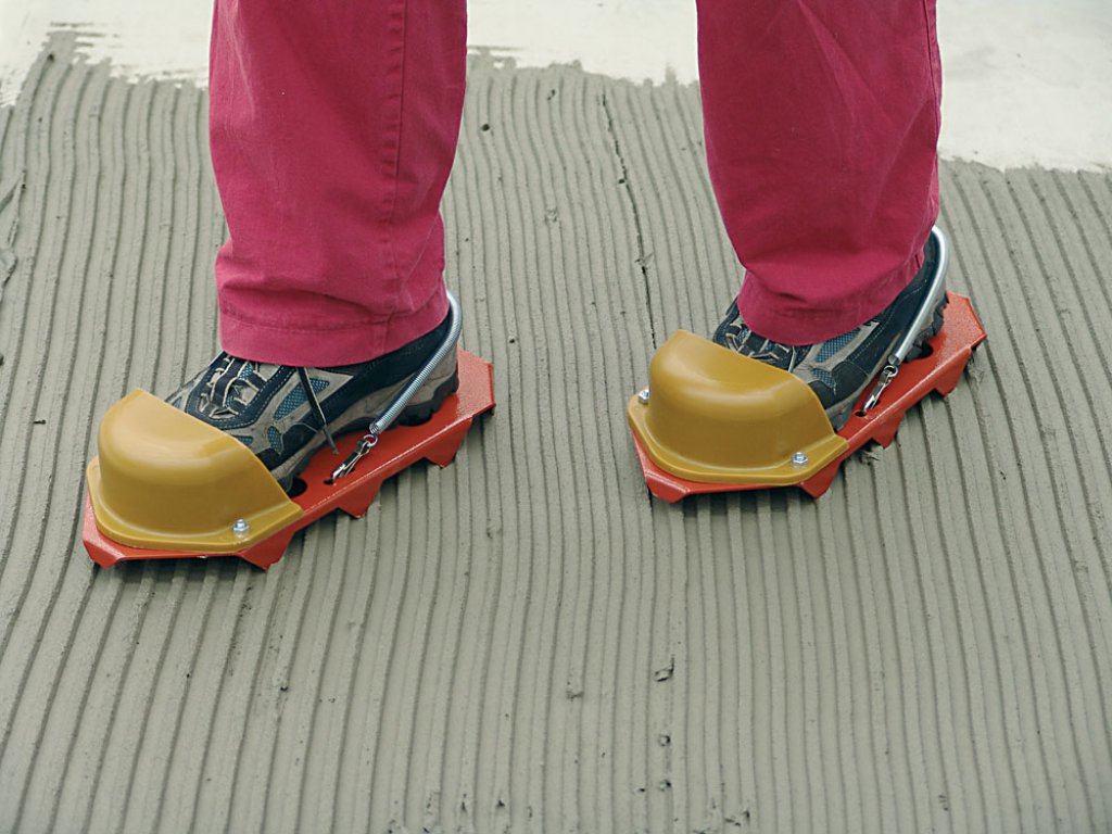 - Schuhe mit Stollensohle sind ein wichtiger Teil der Arbeit, denn auch während des Gießvorgangs müssen die Monteure auf frisch gefüllten Oberflächen laufen, und nur die Stollensohle kann den Aufprall auf flüssiges Material reduzieren.