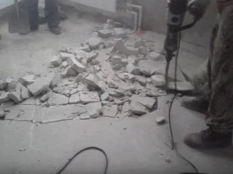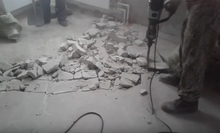 - Ein Presslufthammer sollte einen kleinen Teil des Estrichs aushöhlen. Dies ist notwendig, um zu verstehen, wie dick das Fundament ist, ob es irgendwelche Verbindungen gibt. Während der Demontage sollte die Kommunikation nicht beeinträchtigt werden. In diesem Stadium, schätzen Sie die mögliche Menge an Ablagerungen.