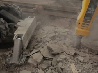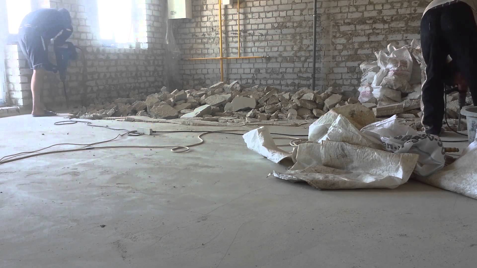 - Der Koppler wird nach und nach durch einen Presslufthammer zerstört. Die Arbeiten sollten an der gegenüberliegenden Wand beginnen, die sich gegenüber dem Ausgang des Raumes befindet. Die Person beginnt ihre Bewegung von ihr zur Tür hin und zerstört allmählich den Estrich. Es sollte darauf geachtet werden, die Überschneidung nicht zu durchbrechen.