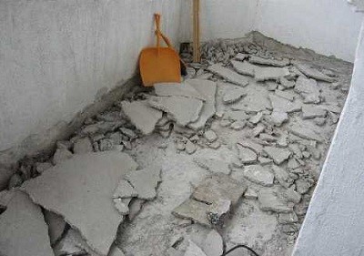 Der Abbau des Estrichs erfolgt durch Aufbrechen des Monolithen in separate Teile. Für die Entfernung von Zementresten im Voraus bereiten Sie starke Müllsäcke vor. Bereiten Sie den Raum vor Beginn der Arbeit vor. Alle Möbel und andere Einrichtungsdetails müssen in andere Räume verlegt und mit Zellophan abgedeckt werden, damit sie nicht verstauben. Staub wird sehr viel sein. Es sollte die Sockelleisten, den alten Boden entfernen. Sollte die Beschichtung wiederverwendet werden, trennen Sie sie mit größter Sorgfalt vom Boden.
