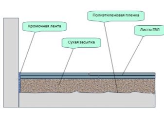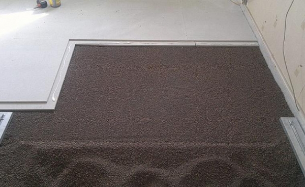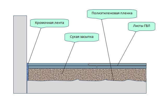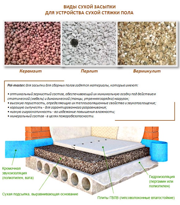 Es ist unmöglich, einen halbtrockenen Estrich mit einem trockenen zu vergleichen. Die trockene Version führt völlig andere Funktionen aus. Es ist vor allem für die Erwärmung oder Erhöhung des Bodens gelegt. Das Schüttgut, das zwischen Leuchttürme oder Lags gelegt wird, ist mit zwei Schichten aus Gipsfaserplatten bedeckt. Die Nähte sind geklebt, um das Eindringen von Staub zu verhindern, der in dem Füllmaterial vorhanden ist. Der Boden für das endgültige Finish wird so eben sein, wie es die Deckblätter erlauben.