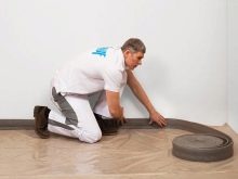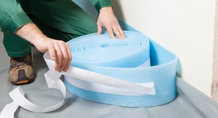 - Kantenband. Es dient zur zusätzlichen Schalldämmung. Absorbiert die Geräusche von menschlichen Schritten und anderen möglichen Geräuschen. Legen Sie es über die gesamte Raumfläche zwischen Estrich und allen Wänden.
