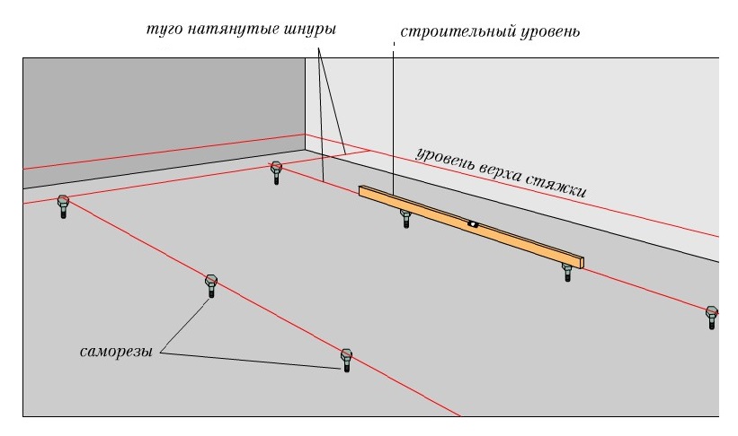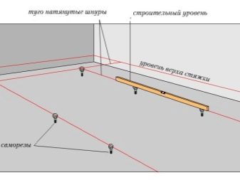 - Installation von Beacons und Profilen. Ohne diese Elemente ist es schwierig, die Verfüllung zu füllen, insbesondere in einem großen Viererraum. Die Lamellen werden auf den Boden gelegt (egal wo die Arbeit ausgeführt wird: in der Küche, im Wohnzimmer, im Schlafzimmer, im Büro oder im Fabrikraum), sie werden von der Gebäudeebene und der Regel eingeebnet.