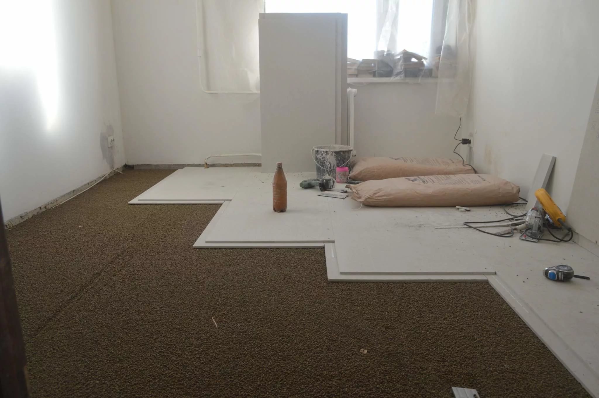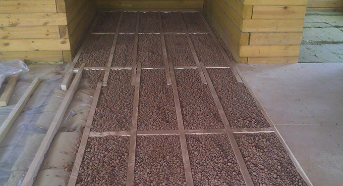 - Verfüllung von Hohlräumen mit Blähton. Um die Anzahl der Bewegungen entlang der Oberfläche des neuen Estrichs zu verringern, wird die Blähtonfraktion von der Seite gegenüber der Tür gestartet.Solche Arbeiten müssen sowohl mit einem Holzboden als auch mit anderen Arten von Bodenbelägen durchgeführt werden.