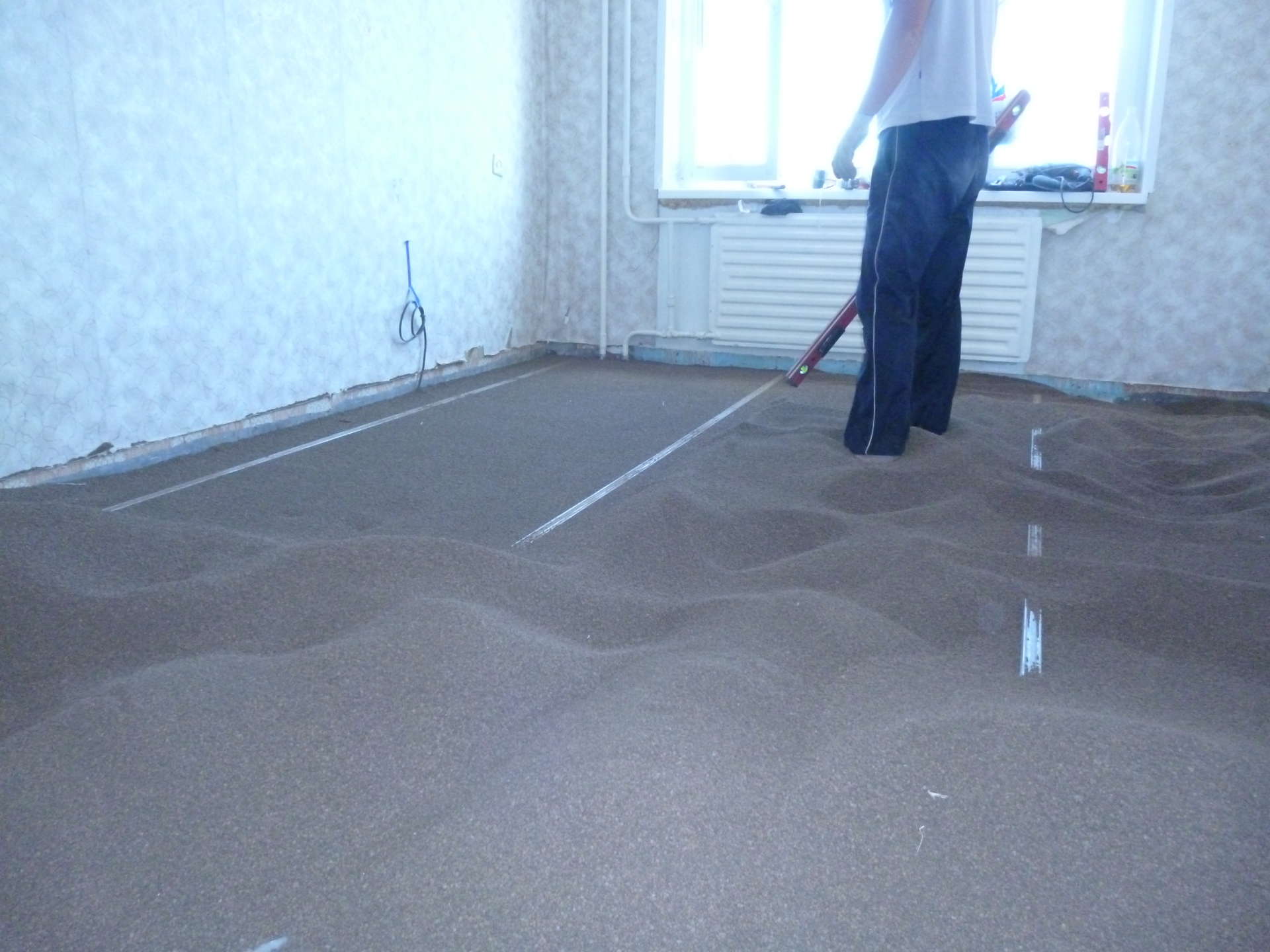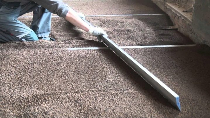 - Trocken füllen. Der am häufigsten verwendete Clay-Sand mit einer Fraktion von nicht mehr als 5 mm. Für die Verfüllung werden ebenfalls Materialien wie Perlit, Quarzsand, feinkörnige Schlacke usw. verwendet, die den Untergrund des Bodens ausgleicht und alle Unregelmäßigkeiten, Gruben und Abhänge glättet. Die Mindestdicke der Trockenfüllschicht sollte mindestens zwei Zentimeter betragen.