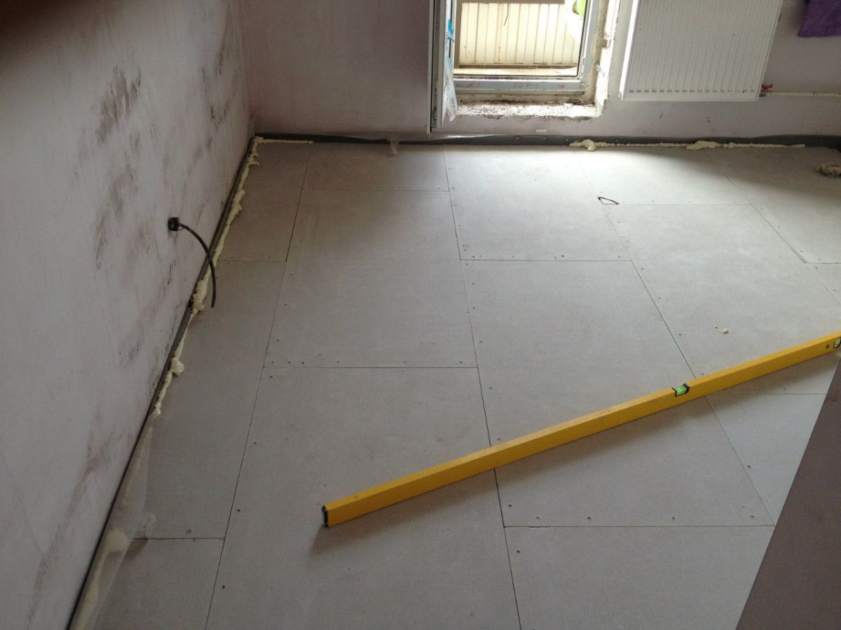- Den Boden legen. Nach dem Prinzip der Verfüllung wird von der hinteren Ecke des Raumes bis zur Haustür gearbeitet. Knauf Platten werden mit selbstschneidenden Schrauben befestigt.