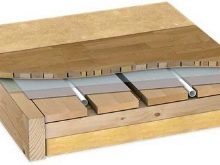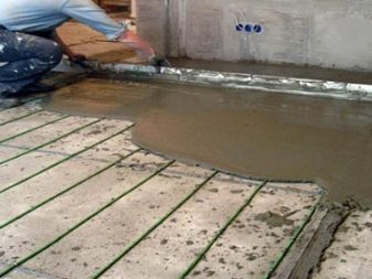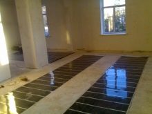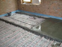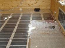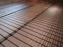 - Beton. Im monolithischen Zement-Sand-Estrich sind Heizelemente montiert. Eine reflektierende Folie ist aufgereiht, eine dünne Platte aus Faserplatten, Spanplatten, Kork oder anderen Materialien, die den Bodenbelag vor Überhitzung schützt, ist oben.