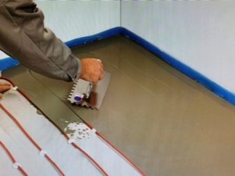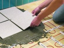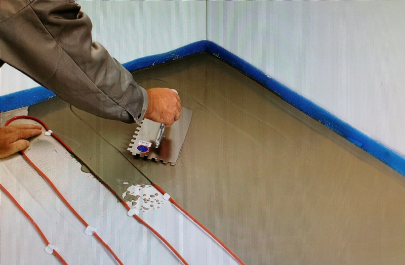 Wenn ein Thermomat verwendet wird, wird sofort Fliesenkleber darauf gegossen und die Fliesen werden fixiert. Beim Verlegen der Kabelanlage müssen Sie zuerst den Estrich ausgießen, warten bis er vollständig trocken ist und erst dann wird der Bodenbelag verlegt.