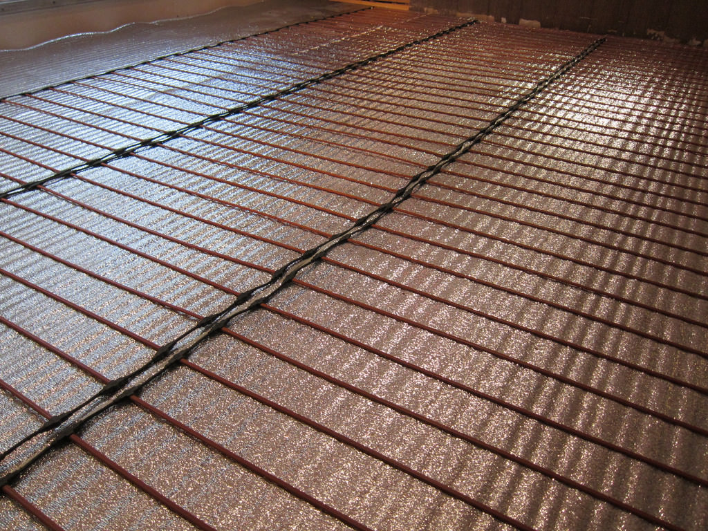 Der Einbau einer Fußbodenheizung sollte mit einer hochwertigen Wärmedämmung der darunter liegenden Fläche beginnen. Optimale Materialien mit Folienschicht, wodurch die Wärme nach oben auf die Fliese reflektiert wird.