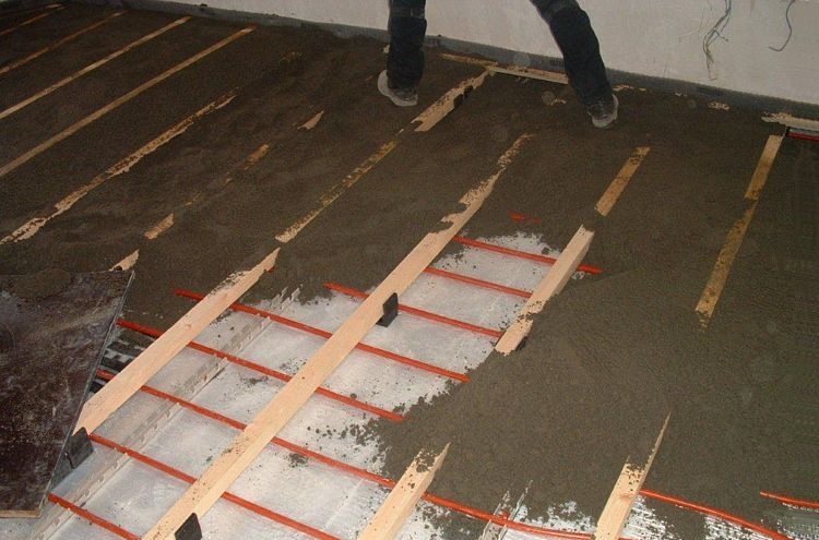 - Die erste, Beton, beinhaltet Gießen eines Beton Estrich direkt auf die Rohre, die die Stärke der Beschichtung und gleichmäßige Verteilung der Wärme über die Oberfläche gewährleistet.Dies erhöht jedoch das Gewicht des Bodens (mit einer Estrichdicke von 50 mm und das Rohrgewicht pro 1 m2 kann 250-300 kg erreichen) und verringert die Raumhöhe.