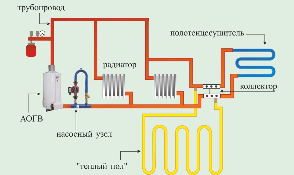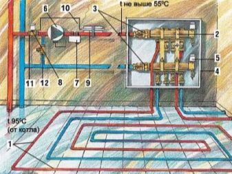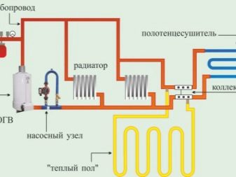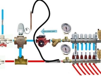 Das einfachste Schema kombiniert alle Rohre zu einer einzigen Mannigfaltigkeit. Das verbesserte Schema nimmt eine Addition in der Form eines Dreiwegeventils mit einem Wärmesensor und einem Thermokopf an. Betrachten Sie alle Details.
