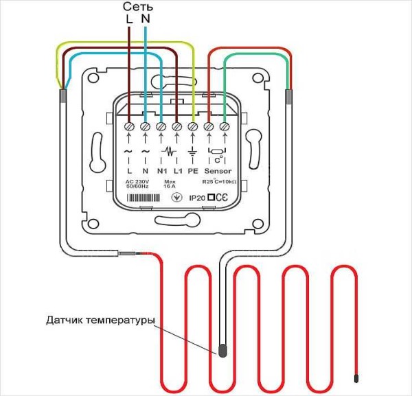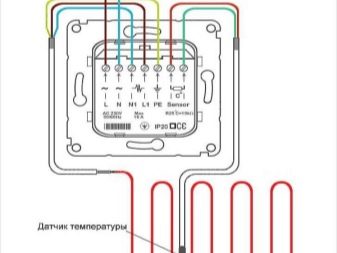Infrarot-Fußbodenheizung ist durch thermische Sensoren verbunden. Dieses Gerät hilft Energie zu sparen und macht Ihr System automatisch. Die typische Installation eines IR-Films durch einen thermischen Sensor hat ein Standard-Erscheinungsbild. Wie im Falle des Kabelsystems, haften die Phase und Null an den entsprechenden Anschlüssen an der Steuerung. Von den übrigen Anschlüssen befinden sich Leiter auf dem Temperatursensor. Eine kleine negative Eigenschaft der Schaltung ist die Verwirrung zwischen den Kabeln.