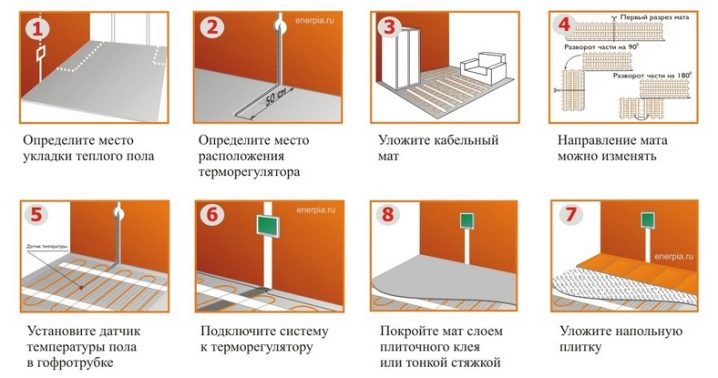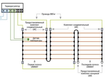Zum Beispiel ist die Installation und Installation bei der Erstinbetriebnahme, einschließlich der Heizkabel, nach dem Gießen des Estrichs möglich, ebenso wie die Verlegung der Isolierung auf der Oberfläche. Betrachten Sie die Merkmale der Schemata der Heizelemente: Legen Sie Schlange oder in einem Kreis. Kabelwarmboden - das schwierigste Verbindungssystem, es kann nicht direkt ohne Erdung montiert werden. Einfacher mit elektrischen Matten zu arbeiten. Dies ist das gleiche Kabel, in einer speziellen Folie montiert. Der Strom wird von einem speziellen Schild ohne einen Wärmesensor angeschlossen. Elektrische Filme sind günstig in der Anordnung und kostengünstig.