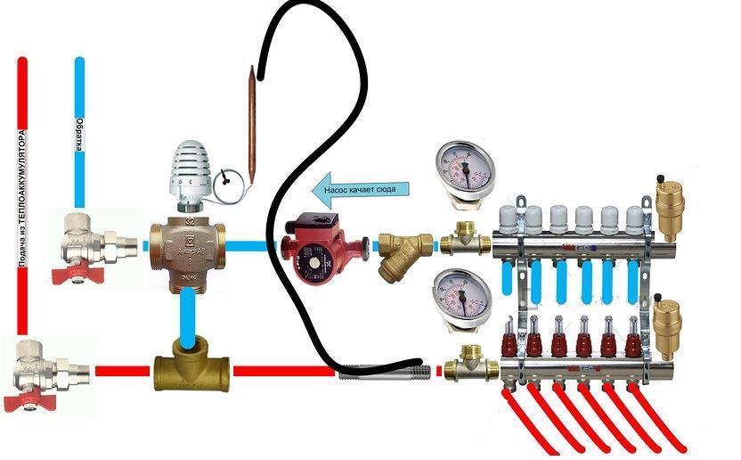 - Installation der Mischpumpe. Die Verbindung kann zwar ohne Pumpe hergestellt werden. Es wird benötigt, um die Temperatur des Trägers im Falle einer Überhitzung zu reduzieren;