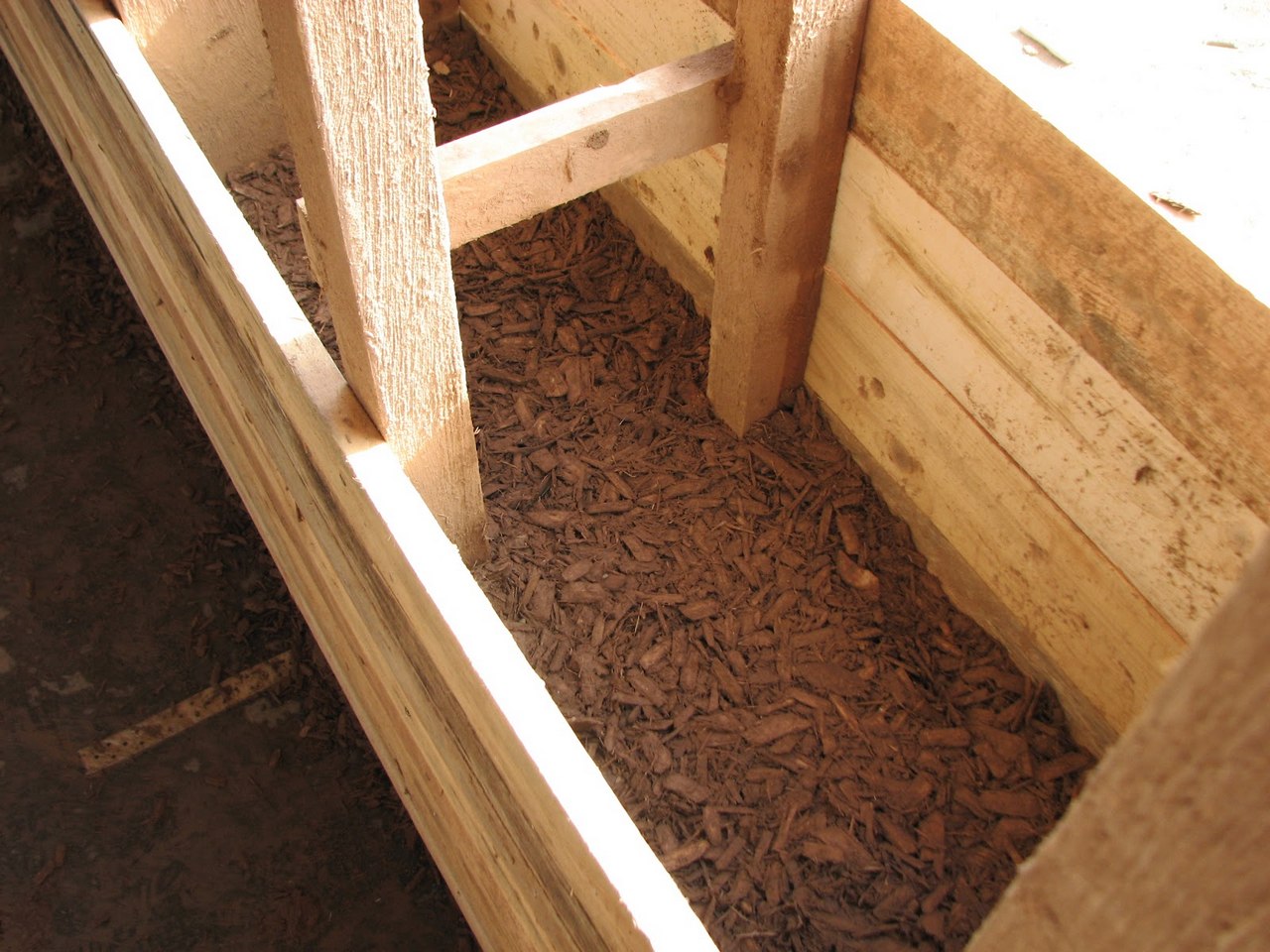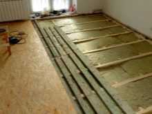 Faserplatten werden verwendet, um Böden auf einer flachen Unterlage zu isolieren, Granulat zum Füllen zwischen den Rückständen auf rauhen Böden. Die Dicke der Dämmschicht beträgt 18 cm für den ersten Stock und 15 cm für den zweiten Stock.