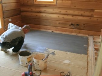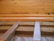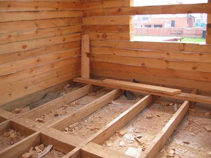 - Wenn es eine schwimmende Platte gibt (dies wird oft gemacht, wenn Holzhäuser auf nassen Böden gebaut werden), dann kann der Boden auf Baumstämmen oder auf dem Estrich angeordnet werden.