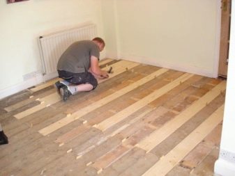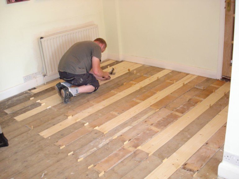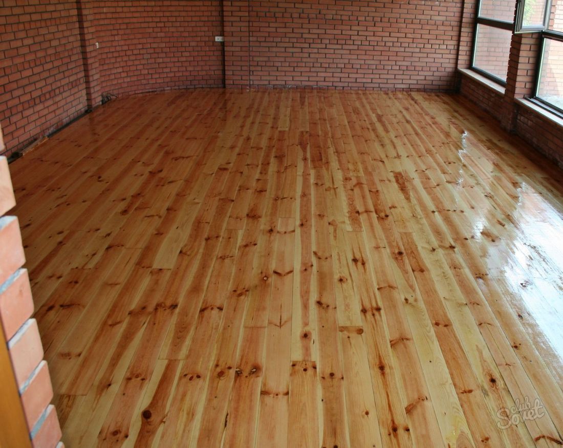 - Wenn das Fundament ein Klebeband ist, kann der Boden direkt auf dem Boden oder an der Decke, auf den Balken angeordnet, verlegt werden.